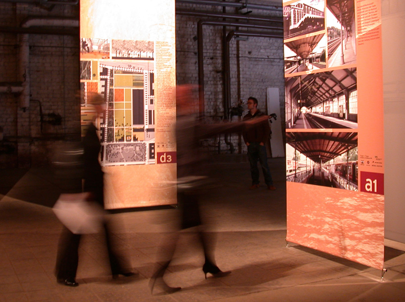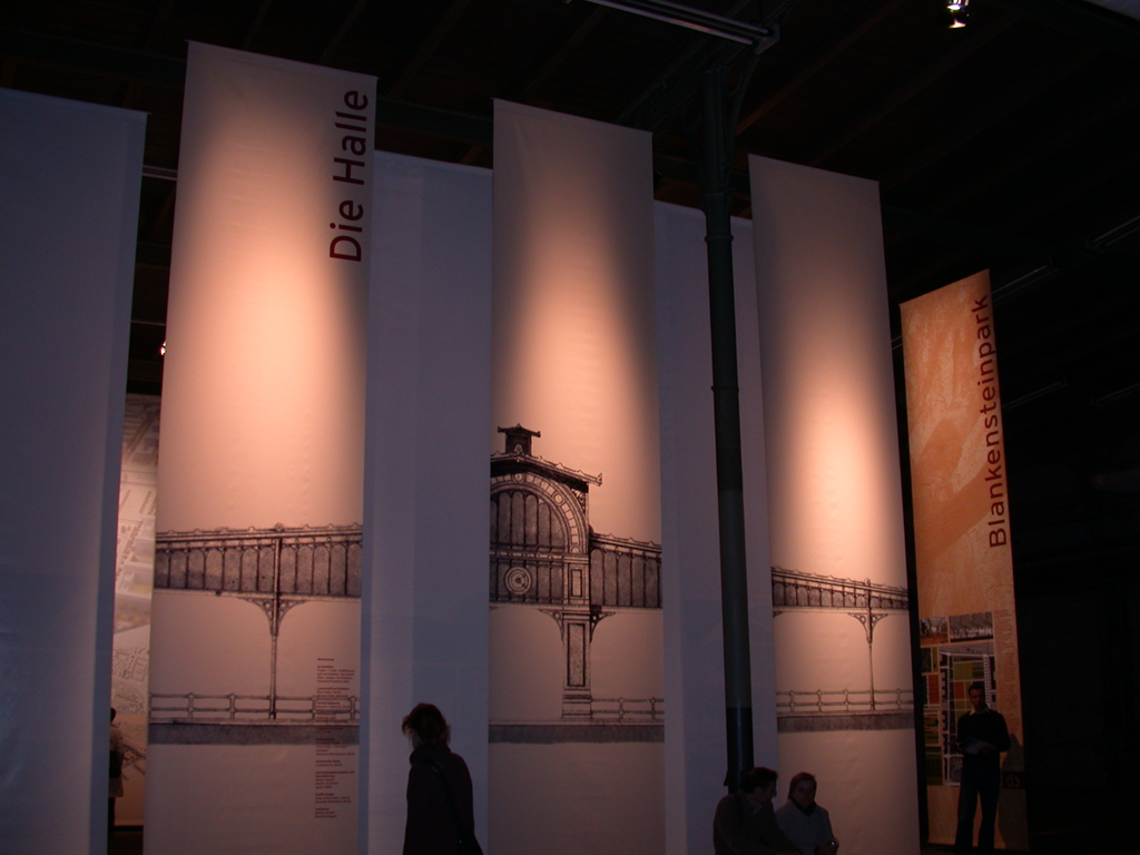 Anlässlich der Neubelebeung des Areals des Berliner Zentralvie- und Schlachtofes wurde dese Ausstellung in der ehemaligen Rinderauktionshalle konzipiert. Im der abgedunkelten Halle waren die beleuchteten Ausstellungsbanner die einzig hellen Elemente.