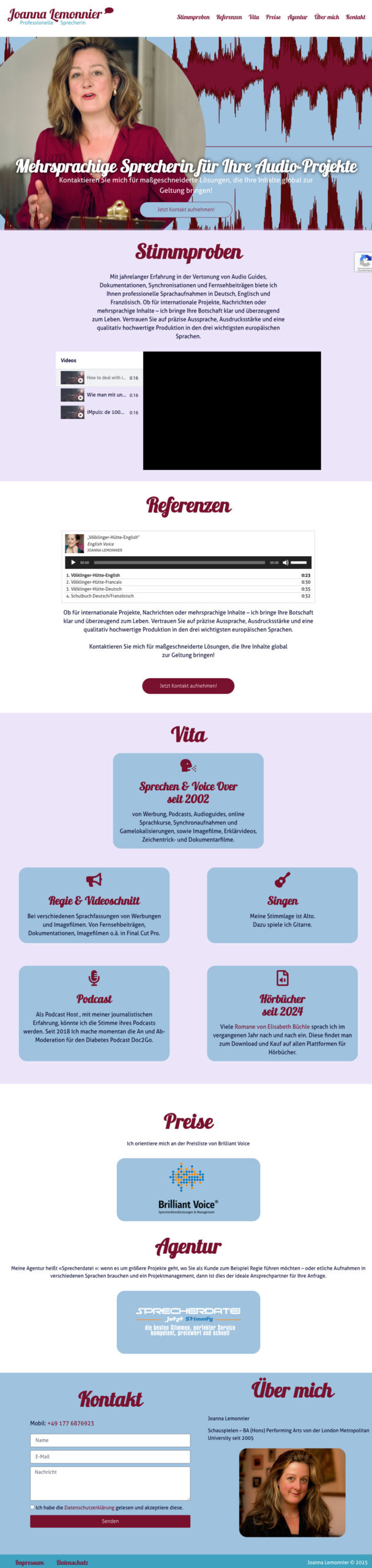 Webseite für eine professionelle Sprecherin mit Stimmproben, Referenzen und Call-to-Action-Element